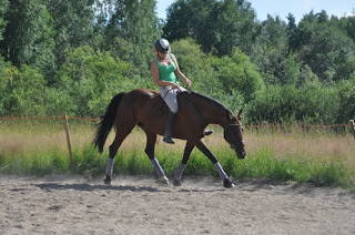 Menin ennen Jennaa tallille, kun sen aikataulu taas vähän kusas... :D. Laitoin Vikin kuntoon ja siirryin kentälle siivoamaan pari estettä pois ja Jenna ilmestyikin kentälle med kamera pari minuuttia myöhemmin. Tein Vikin kanssa aluksi käynnissä pohkeenväistöjä ja taivuttelin huolellisesti. Neiti toimi aika hyvin :) Sitten taivuttelin Vikin ravissa molempiin suuntiin, jonka jälkeen laukkasin molempiin suuntiin aluksi kevyessä istunnassa ja sitten työstin molemmat laukat kunnolla perusistunnassa. Viki toimi ja pyöritti laukkoja hyvin.