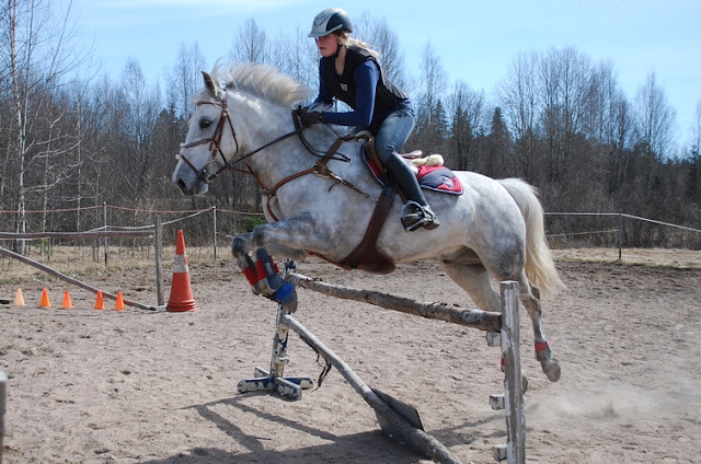 Lauantaina olikin vuorossa Vikillä ja Fasulla kentällä hyppäilemistä, tehtävänä toimi sama pikkutehtävä mitä Erikakin oli aikaisemmin viikolla mennyt Helkan kanssa. Tiia hyppäsi Vikin kanssa ensimmäiseksi ja viimeeksi kaksikko olikin hypännyt rataa viime kisoissa reilu kuukausi sitten. Aloiteltiin ihan pikku korkeuksista ja nostettiin kaikkia esteitä pikkuhiljaa hyvien hyppyjen jälkeen. Korkein rata oli n. 80cm ja ratojen jälkeen Tiia hyppäsi hetken linjaa, jonka toinen este oli lopuksi metrin. Estetreenit menivät kokonaisuudessaan tosi hyvin muutamaa tiputusta lukuunottamatta ja Viki oli kuulemma tosi hyvän ja varmantuntuinen hypätä!